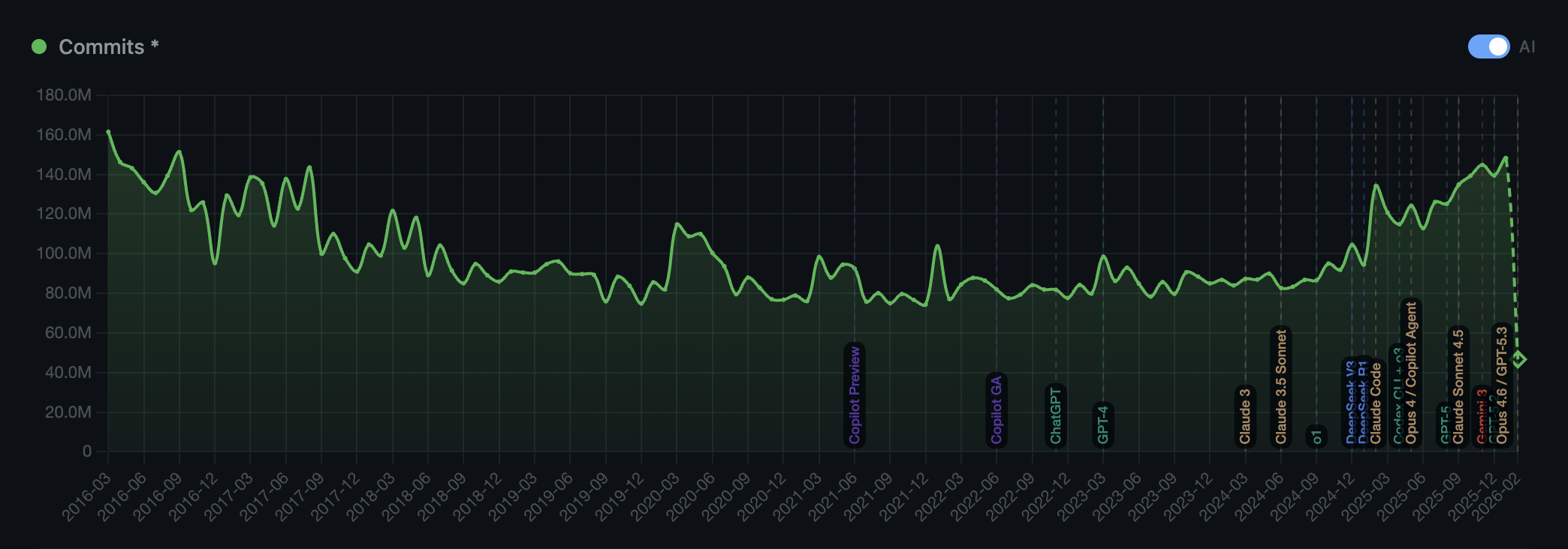 Sadly Commits are less useful as a Github metric, because when you fork the a 15 year old repository, you're adding 15 year old commits to Github, so the long history is unrepresentative. But recent history might be a tad more representative. And that also seems to be going up faster.